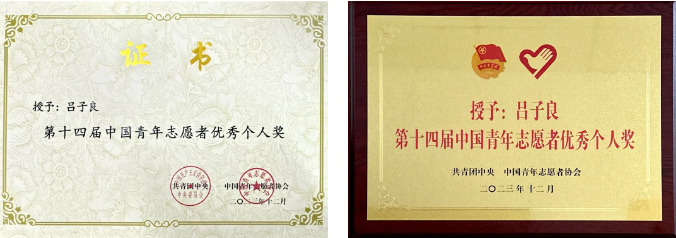 2023级硕士研究生吕子良荣获“中国青年志愿者优秀个人奖”(全国260人,北京市仅13人),是唯一获此荣誉的北京市大学生。