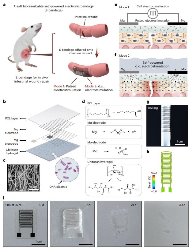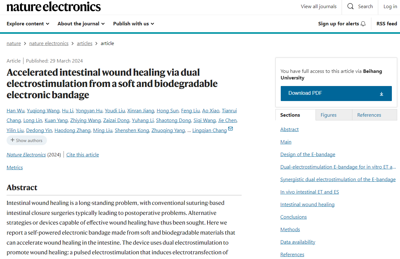 3月29日,常凌乾教授团队报道了一种柔性、可生物降解、自供电电子绷带,能够提供双模式电刺激,协同加速和改善肠道伤口愈合,并显著减少了术后并发症。相关成果以“Accelerated intestinal wound healing via dual electrostimulation from a soft and biodegradable electronic bandage”为题,发表在《Nature Electronics》上。北航生物与医学工程学院博士生吴晗、王玉琼博士、李虎博士等为第一作者,北航常凌乾教授、王柳助理教授,宾夕法尼亚州立大学余存江教授为通讯作者,北京航空航天大学为第一单位。