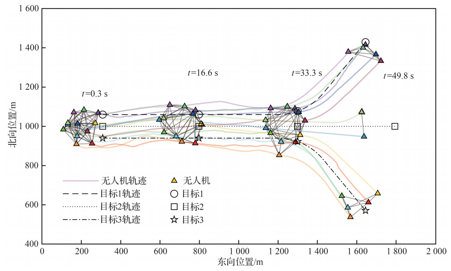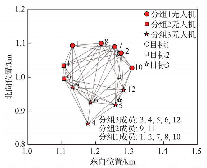 本文提出的方法可在目标跟踪过程中实现动态目标分配决策,可根据各目标的逃逸风险大小确定为各目标分配的无人机数目。在MATLAB仿真环境中,模拟由12架无人机组成的集群对3个地面移动目标进行跟踪。