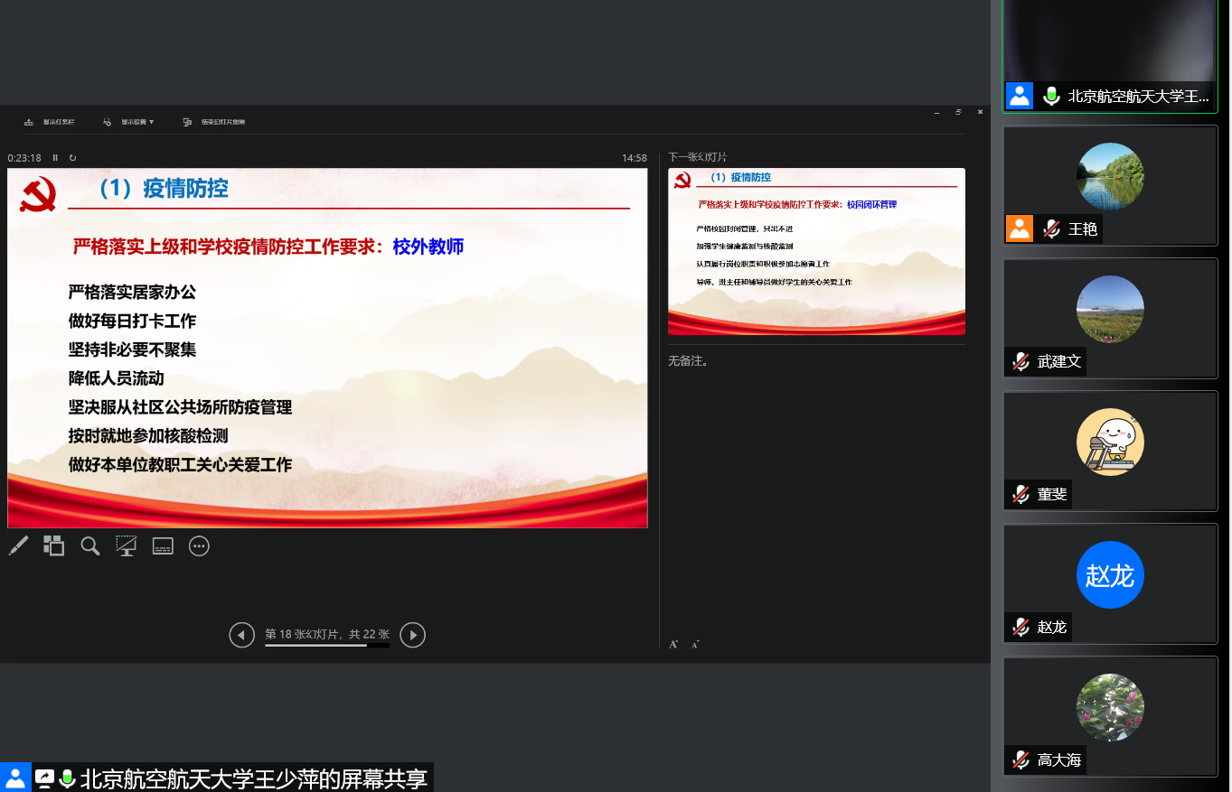 最后王少萍书记和吕金虎院长就近期疫情防控工作进行了政策宣贯和工作部署,各班子成员就教学、科研、党建、管理等各项工作在疫情防控期间的工作要求和部署做了解读。要求全体教师应全面落实党中央、国务院决策部署,坚持“动态清零”总方针,各党支部要提高政治站位,树立大局意识,深入贯彻习近平总书记关于疫情防控的一系列重要指示精神,进一步发挥党支部的战斗堡垒和党员的先锋模范作用,筑牢学校疫情防控的坚实防线。